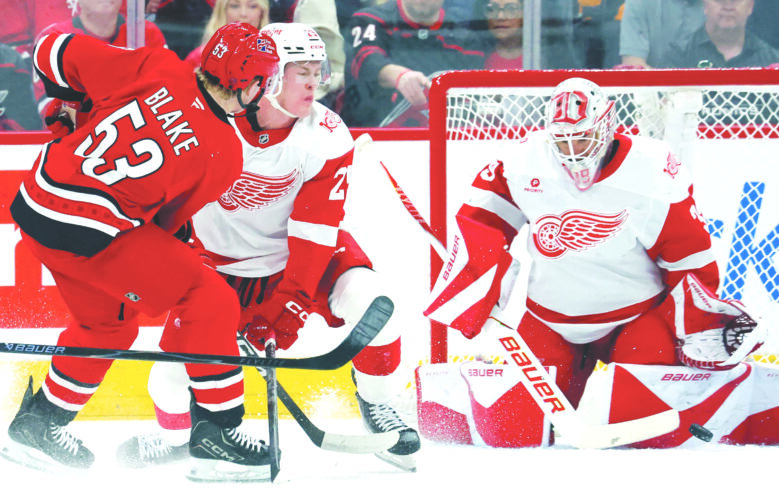 From left, the Carolina Hurricanes' Jackson Blake shoots past the Detroit Red Wings' Jacob Bernard-Docker to hit goaltender Cam Talbot during the first period in Raleigh, N.C., on Saturday. (AP photo)