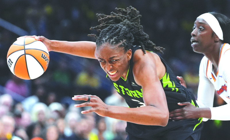 Storm forward Nneka Ogwumike, left, is fouled by Phoenix Mercury guard Kahleah Copper on Aug. 17 in Seattle. (AP file photo)