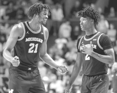 Michigan's Morez Johnson Jr., left, and L.J. Cason react during a game against Illinois on Friday in Champaign, Ill. (AP photo)