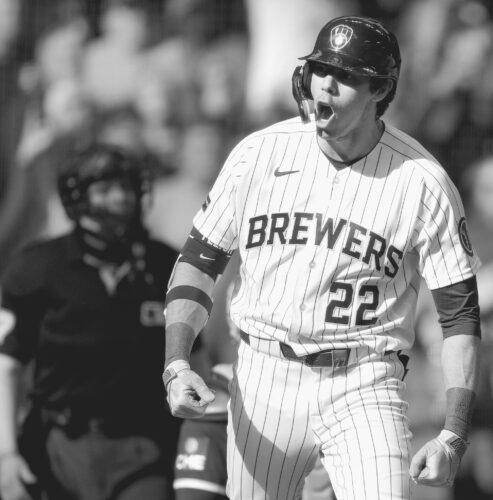 The Brewers' Christian Yelich reacts to hitting a three-run home run during the eighth inning against the Chicago White Sox on Sunday in Milwaukee. (AP photo)