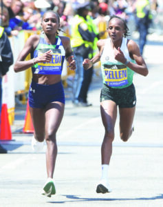 Sharon Lokedi, left, outruns two-time Boston Marathon defending champion Hellen Obiri over the final mile of the course on April 21, 2025. Lokedi won and broke the Boston Marathon course record. (AP file photo)