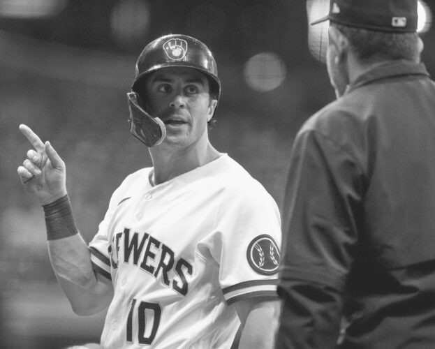 The Brewers' Sal Frelick, left, talks with first base umpire Alfonso Marquez during the sixth inning against the Arizona Diamondbacks on Tuesday in Milwaukee. (AP photo)