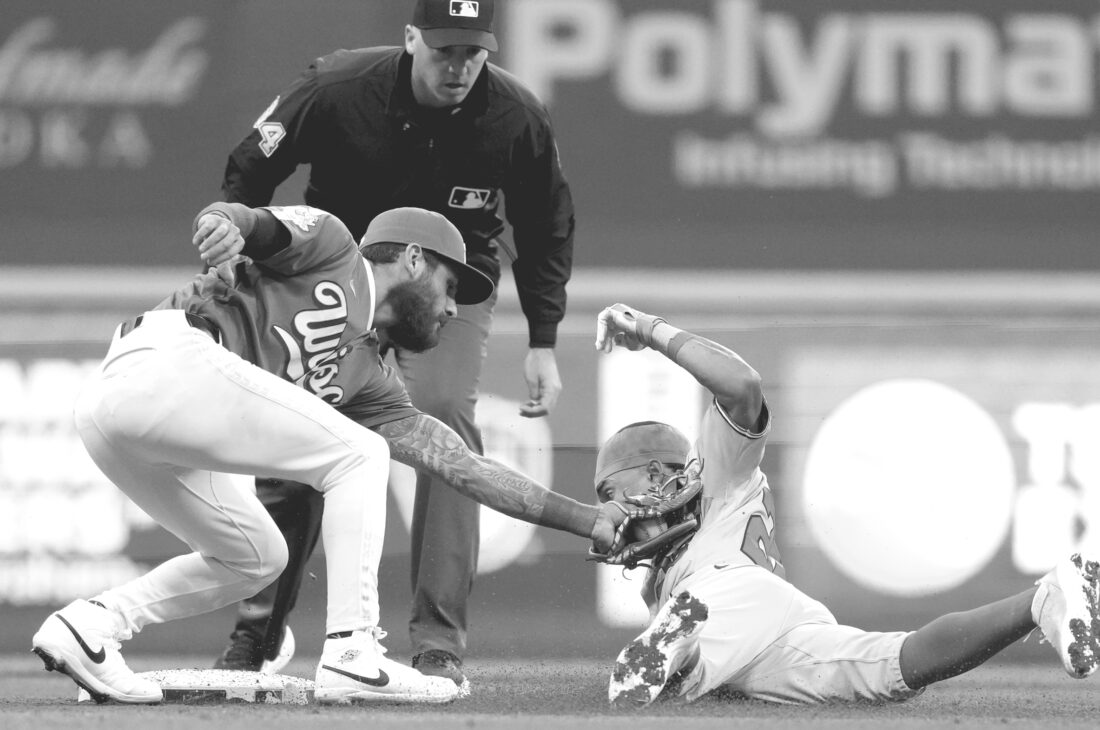 The Brewers' Joey Ortiz, left, tags out the Washington Nationals' Nasim Nuñez at second base during the third inning on Saturday in Milwaukee. (AP photo)