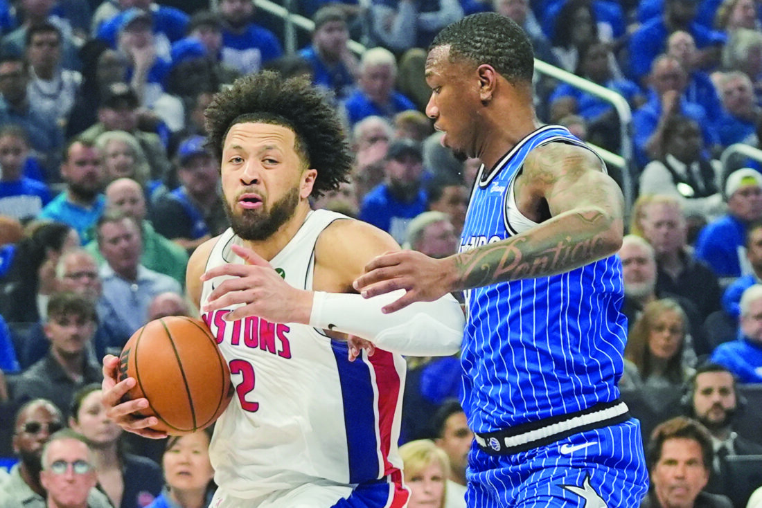 Detroit Pistons guard Cade Cunningham, left, moves past Orlando Magic forward Jamal Cain during the first half in Game 4 of a first-round NBA basketball playoff series on Monday in Orlando, Fla. (AP photo)