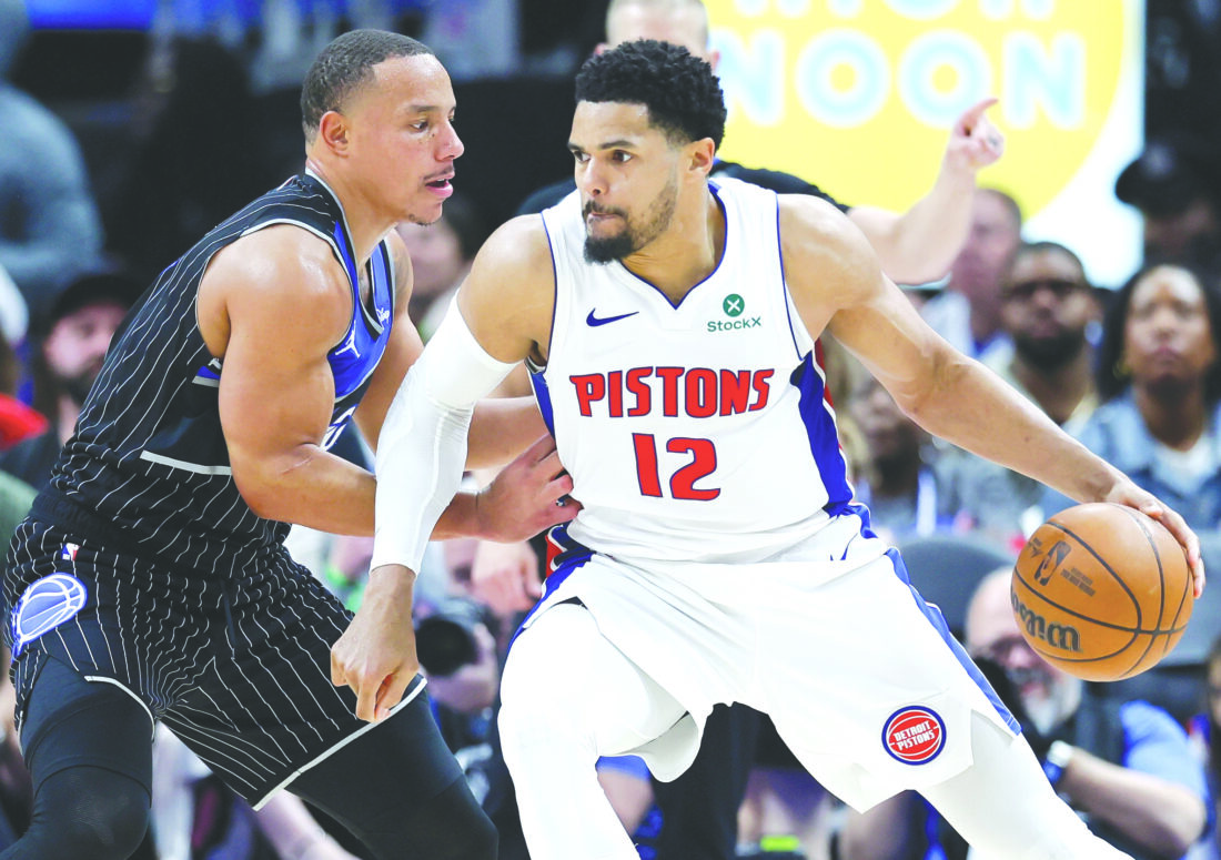 Pistons forward Tobias Harris, right, drives against Orlando Magic guard Desmond Bane during the second half in Game 2 of their first-round NBA playoff series on Wednesday in Detroit. (AP photo)