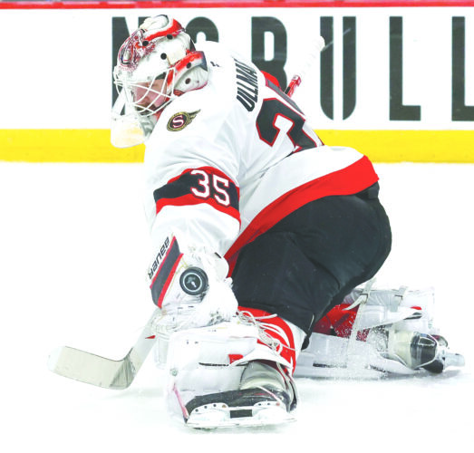 Ottawa Senators goaltender Linus Ullmark knocks the puck away on a penalty shot by the Carolina Hurricanes' Jordan Martinook in overtime of Game 2 of their NHL Stanley Cup first-round playoff series in Raleigh, N.C., on Monday. (AP photo)