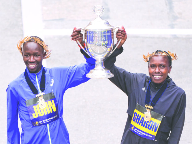 Winner John Korir of Kenya, left, hoists the trophy with women's division winner Sharon Lokedi, also of Kenya, at the finish line of the Boston Marathon on Monday in Boston. (AP photo)