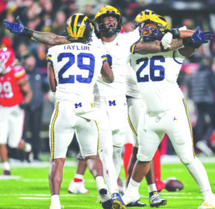 Michigan defensive end Derrick Moore, center, celebrates with Wolverines teammates after a sack of Maryland quarterback Malik Washington to force a turnover on Nov. 22 in College Park, Md. (AP file photo)
