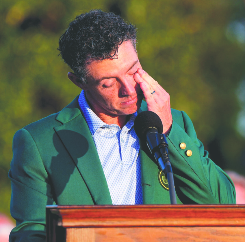 Rory McIlroy wipes his eyes during the green jacket ceremony after winning the Masters at the Augusta National Golf Club on Sunday in Augusta, Ga. (AP photo)