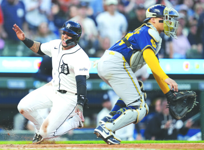 The Tigers' Javier Báez, left, scores as Milwaukee Brewers catcher William Contreras waits for a throw in the fifth inning on Wednesday in Detroit. (AP photo)