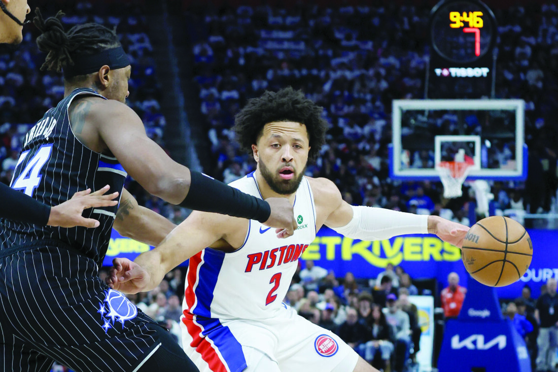 Detroit Pistons guard Cade Cunningham (2) drives against Orlando Magic center Wendell Carter Jr. (34) during the first half in Game 1 of a first-round NBA basketball playoffs series on Sunday in Detroit. (AP photo)