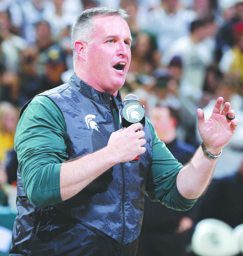 Pat Fitzgerald, Michigan State's newly hired head football coach, addresses the crowd during the first half of a Spartans' basketball game against Iowa on Dec. 2 in East Lansing. (AP file photo)