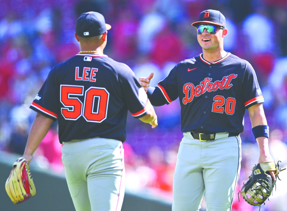 The Detroit Tigers' Spencer Torkelson, right, celebrates with teammate Hao-Yu Lee after defeating the Reds in Cincinnati on Sunday. (AP photo)