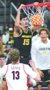 Michigan center Aday Mara, top, dunks over Arizona center Motiejus Krivas during the second half in their NCAA tournament semifinal game at the Final Four on Saturday in Indianapolis. (AP photo)