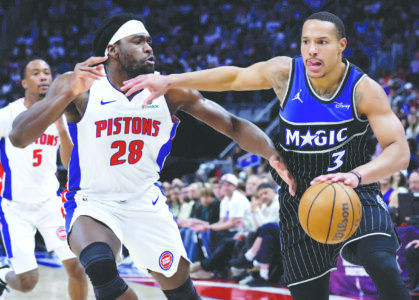 Orlando Magic guard Desmond Bane, right, drives against Pistons forward Isaiah Stewart during the second half in Game 1 of their first-round NBA playoff series on Sunday in Detroit. (AP photo)