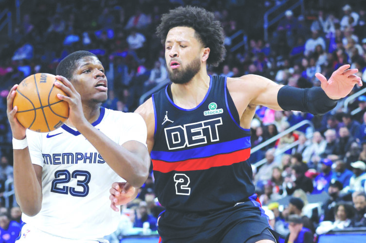 Memphis Grizzlies forward Cedric Coward, left, drives against Pistons guard Cade Cunningham in the first half on March 13 in Detroit. (AP file photo)