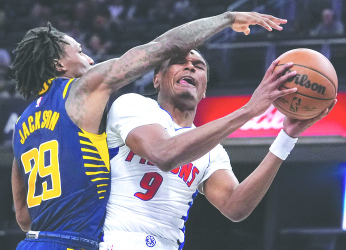 Indiana Pacers guard Quenton Jackson, left, fouls Detroit Pistons guard Ausar Thompson during the second half in Indianapolis on Sunday. (AP photo)