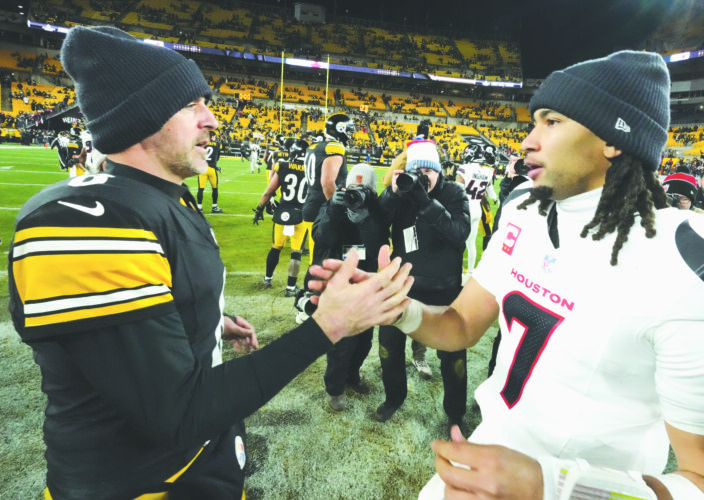 Steelers quarterback Aaron Rodgers, left, greets Houston Texans quarterback C.J. Stroud after their NFL wild-card playoff game on Jan. 12 in Pittsburgh. (AP file photo)