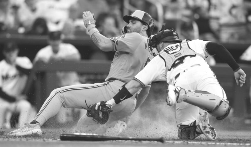 The Milwaukee Brewers' Garrett Mitchell, left, beats the throw to Marlins catcher Liam Hicks to score in the sixth inning on Saturday in Miami. (AP photo)