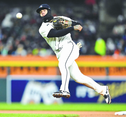 Tigers shortstop Javier Báez throws to first base for an out in the sixth inning against the St. Louis Cardinals on Sunday in Detroit. (AP photo)