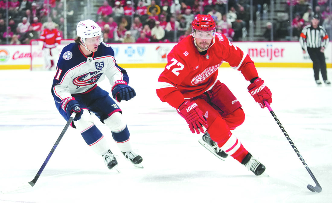 Red Wings defenseman Justin Faulk, right, protects the puck from Columbus Blue Jackets center Kent Johnson in the second period on Tuesday in Detroit. (AP photo)