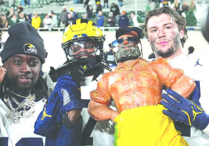 From left, Michigan defensive back Rod Moore, defensive back TJ Metcalf and tight end Marlin Klein hold up the Paul Bunyan Trophy after the Wolverines' win against Michigan State on Oct. 25 in East Lansing. (AP file photo)