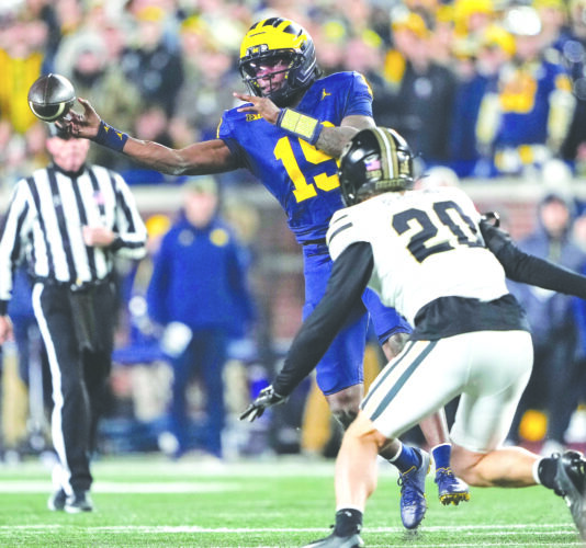 Michigan quarterback Bryce Underwood, left, throws under pressure from Purdue linebacker Winston Berglund in the second half on Nov. 1 in Ann Arbor. (AP file photo)