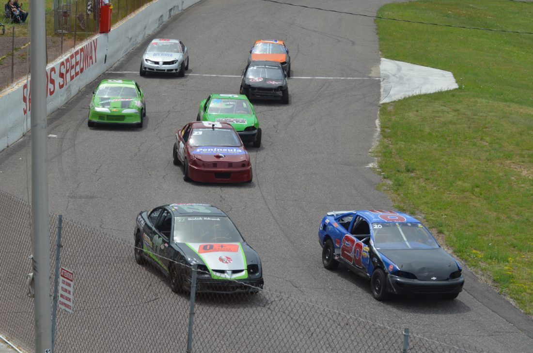 - Dustin Livingston (No. 20) and Mick Waselesky (No. 22) lead the pack in heat race No. 1 in the 4-cylinder stock class at Sands Speedway on Sunday afternoon. (Journal photo by Ryan Spitza)