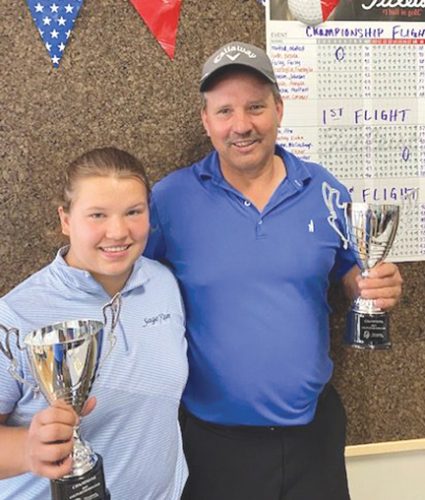 Laci Moffatt, left, and Mike Moffatt won the championship flight of the annual Couples Ryder Cup held June 27 at Wawonowin Country Club near Champion. The Moffatts made a birdie on the 18th and final hole to edge out Kirk Giotto and Jamie Besola to earn the title of overall champions. Other flight winners were Jeff Aho and Mary Aho in the first flight, Robyn Nardi and Bob Nardi in the second, Christy Cain and Dean Cain in the third, Dean Bocklund and Sharon Bocklund in the fourth and Norman Stanaway and Beth Stanaway in the fifth.