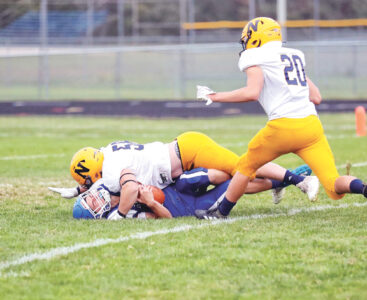 - On the opening play from scrimmage, Ishpeming quarterback Hunter Smith, bottom, is sacked by Negaunee’s Drake Spickerman, on top of him, as the Miners’ Easton Palomaki rushes in on the play, too, during their high school game played at the Ishpeming Playgrounds on Sept. 23. (Photo courtesy Daryl T. Jarvinen)