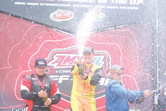 - From left, runner-up Lorenzo Bonacci of Riverside, Calif., winner Jordan Bernloehr of Lakeville, Minn., and third-place Mark Steinhardt of Rhinelander, Wis., celebrate with champagne after taking the top three spots in the pro buggy race on the second day on Saturday during the 2024 Off-Road Rumble in the U.P. at the Bark River International Raceway in Bark River. (Escanaba Daily Press photo by Mitch Vosburg)