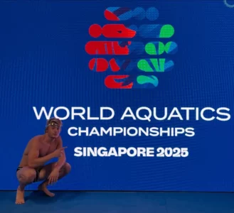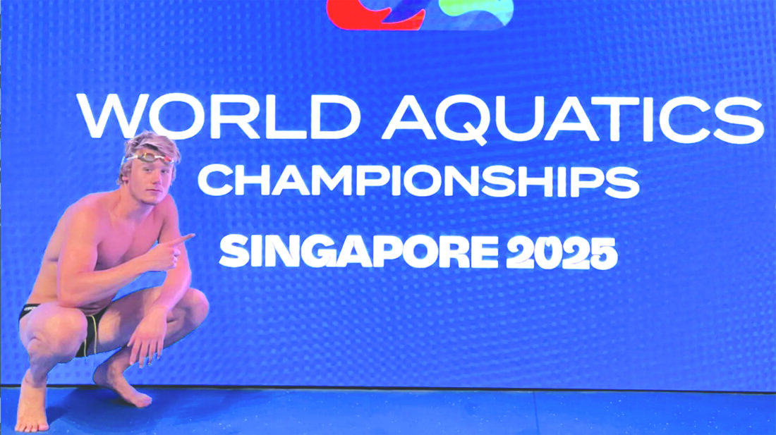 Northern Michigan University swimmer Leo Nolles poses ready for competition as he points at the lighted sign for the World Aquatics Championships that was held in Singapore last week. Nolles, who will be a senior at NMU this fall, represented his home country of Uruguay. (Photo courtesy NMU)