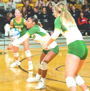 Northern Michigan University’s Remi Madison, center, receives the ball during a GLIAC volleyball match against Michigan Tech played at the Huskies’ SDC Gym in Houghton on Thursday. (David Archambeau photo courtesy Daily Mining Gazette)