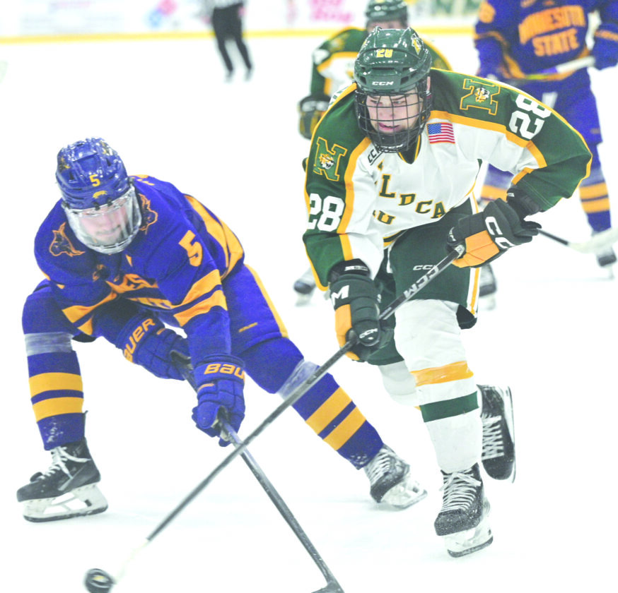 - Northern Michigan University’s Matthew Argentina, right, tries to bring the puck to the net as he attempts to get past Minnesota State-Mankato defender Mason Wheeler during a CCHA game played at the Berry Events Center in Marquette on Jan. 11. (Photo courtesy Cara Kamps)