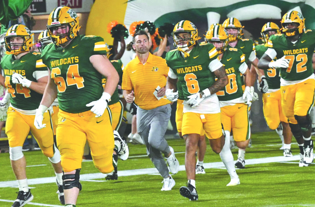 Northern Michigan University head coach Shane Richardson, center, runs out onto the Superior Dome field with his Wildcats football team before a game played earlier this season in Marquette. (Photo courtesy NMU)
