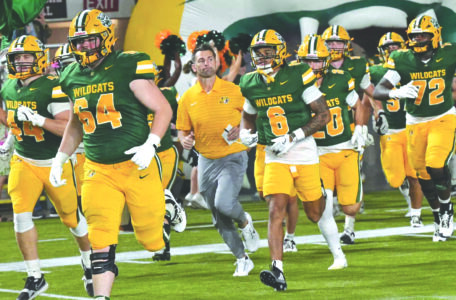 - Northern Michigan University head coach Shane Richardson, center, runs out onto the Superior Dome field with his Wildcats football team before a game played earlier this season in Marquette. (Photo courtesy NMU)