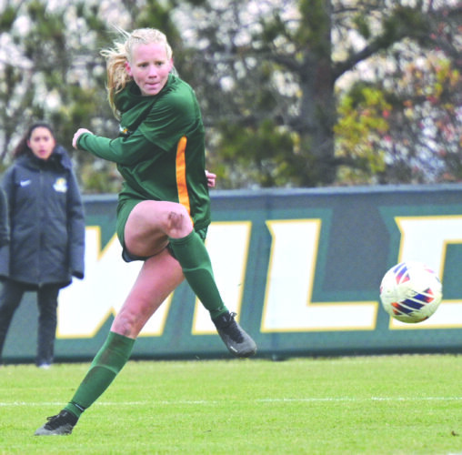 Northern Michigan University’s Hannah Kastamo takes a shot on the Wisconsin-Parkside goal in the first half of their GLIAC game played at the NMU Soccer Field in Marquette on Nov. 2. (Photo courtesy Cara Kamps)