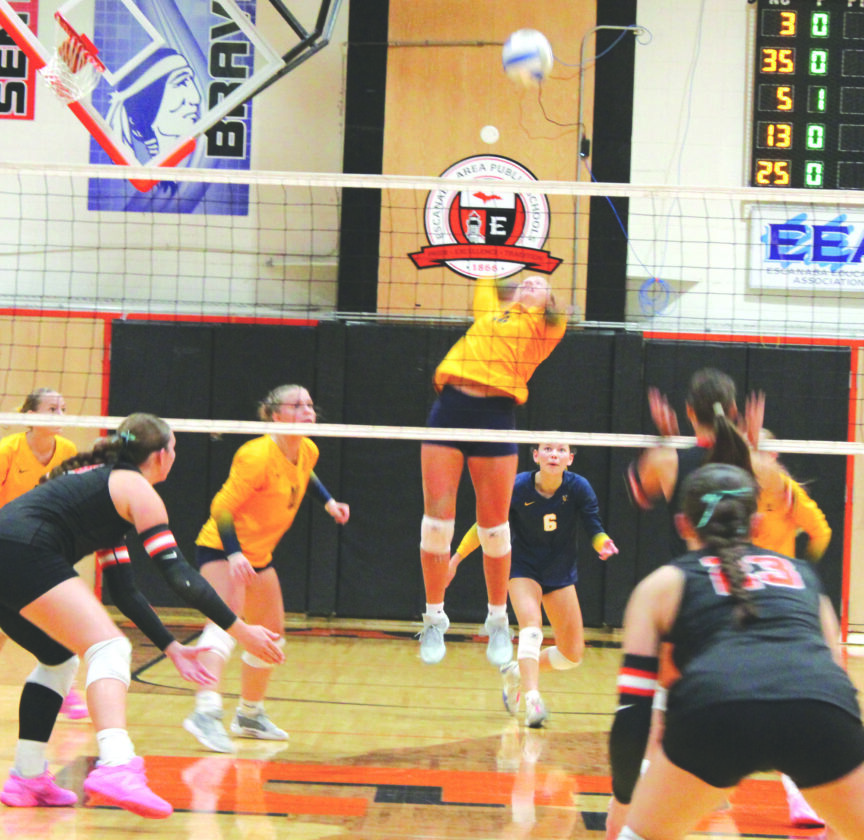 Negaunee’s Gretel Johnson, top center, goes high to make an attempted spike during a high school volleyball match played at Escanaba on Tuesday evening. (Escanaba Daily Press photo by Adam Hinch)
