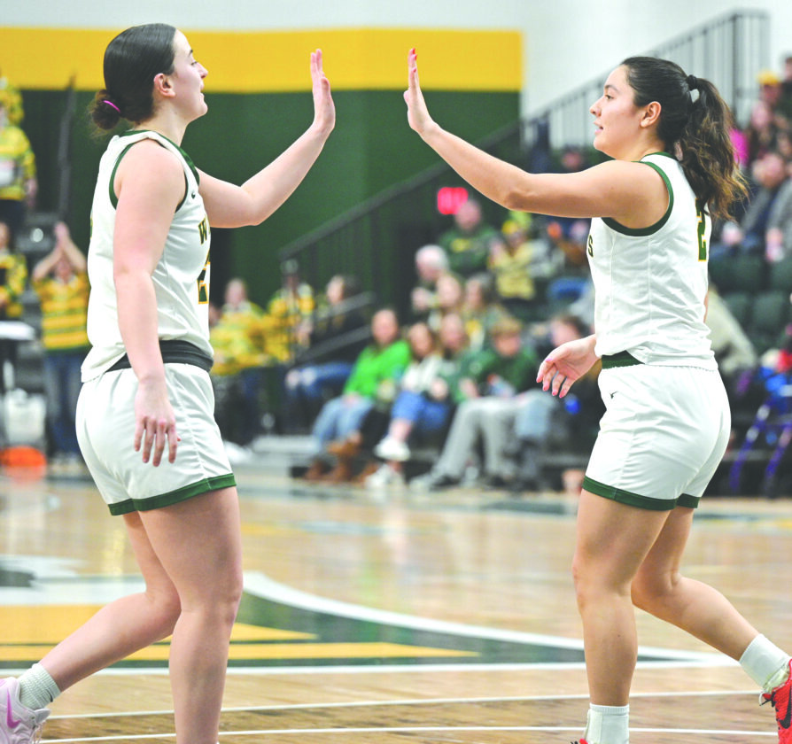 After getting fouled, Northern Michigan University’s Sydney Whitehouse, right, high-fives teammate Jacy Weisbrod during a GLIAC game played against Ferris State at Vandament Arena in Marquette on Feb. 15. (Photo courtesy Cara Kamps)