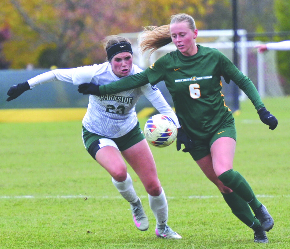 Northern Michigan University’s Addison Frantti, right, blocks Wisconsin-Parkside's Makayla Wesemann from getting to the ball during their GLIAC game played at the NMU Soccer Field in Marquette on Sunday. (Photo courtesy Cara Kamps)