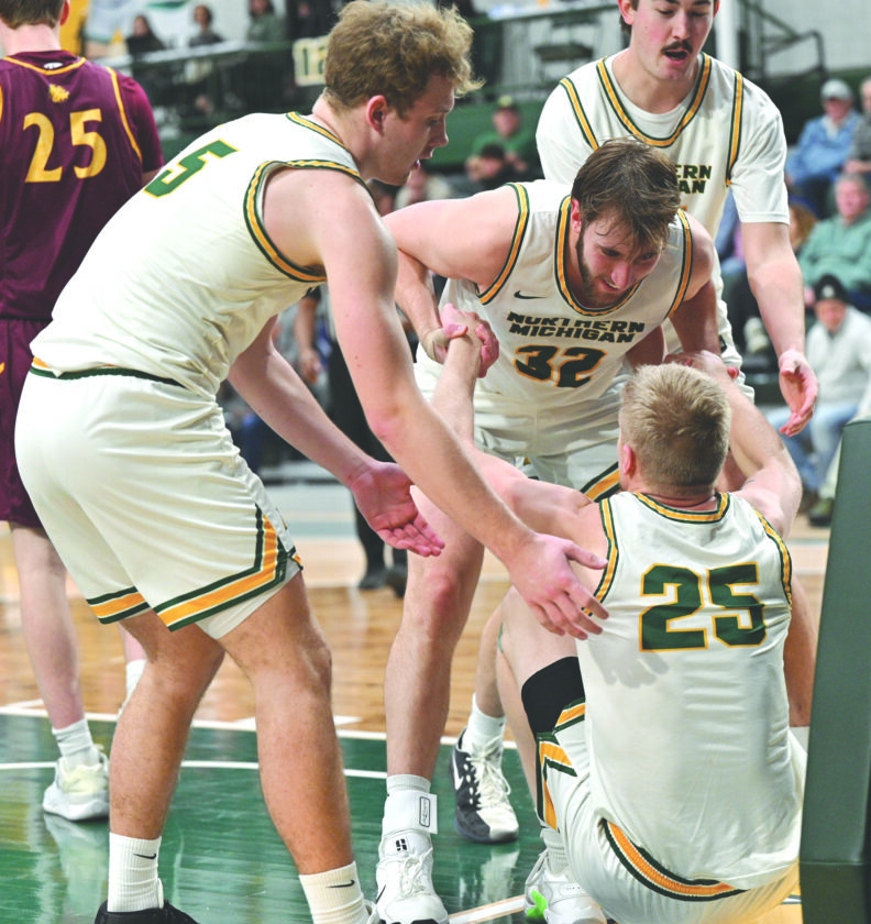 After getting fouled, Northern Michigan University’s Dylan Kuehl, bottom right, gets assistance standing back up from teammates, from left, Brooks Hinson, Jackson Dudek and Sam Privet during a college men’s basketball game played against Minnesota-Duluth at Vandament Arena in Marquette on Saturday. (Photo courtesy Cara Kamps)