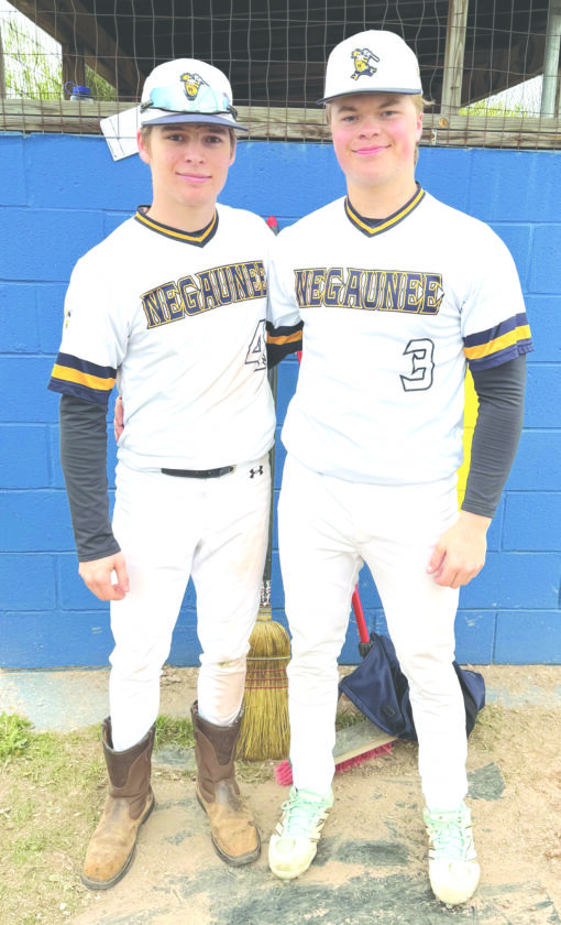 Negaunee High School baseball teammates Morgan Robar, left, and Aidan Steele not only matched no-hitters thrown against visiting Iron Mountain at the Irontown Field in Negaunee on May 20, but served as catcher for the other in the game they were not hurling. (Derek Cardinal photo courtesy Stephanie Robar)