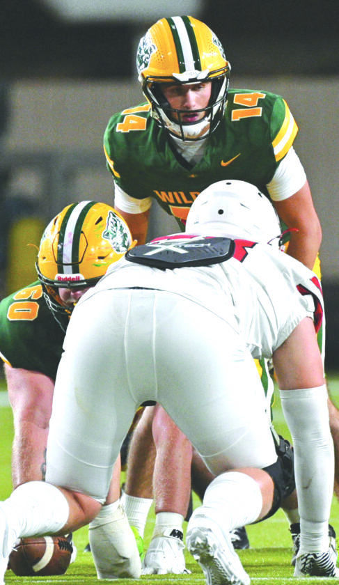 Northern Michigan University quarterback Austin Ridl, top, calls a play behind Wildcats lineman Will Graffin, partially obscured at left, during a game played against Minnesota State-Moorhead at the Superior Dome in Marquette on Aug. 28. Ridl is a Marquette Senior High School graduate. (Photo courtesy Cara Kamps)