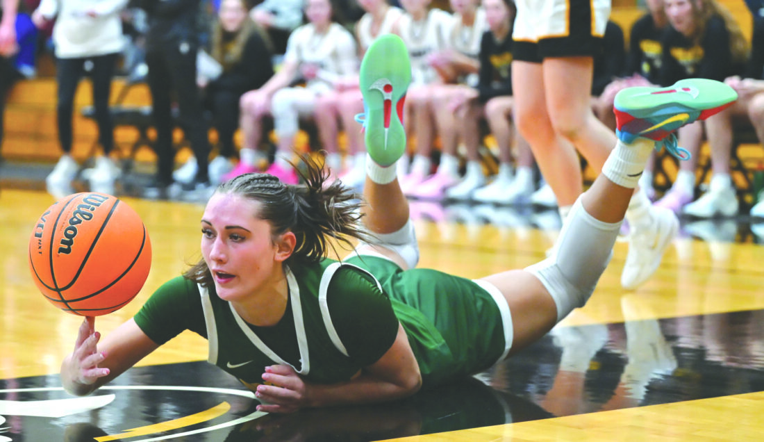 Northern Michigan University’s Jordyn Schmittdiel dives to the floor trying to save the ball from going out of bounds during a GLIAC game played against Michigan Tech in Houghton on Jan. 8. (Photo courtesy Cara Kamps)