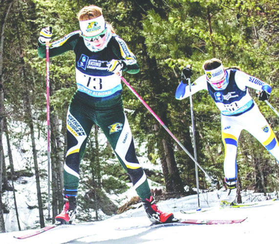 Northern Michigan University’s Henriette Nilssen, left, leads a competitor during a past NCAA women’s nordic ski race held at Al Quaal Recreation Area in Ishpeming. (Photo courtesy NMU)