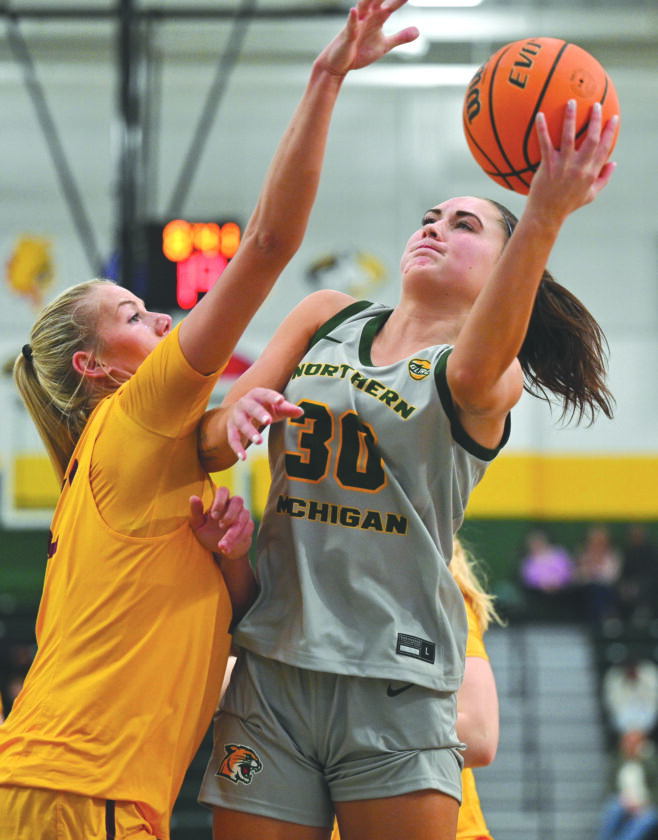 Northern Michigan University’s Jordyn Schmittdiel, right, is fouled going up for a shot during a game played against Minnesota-Duluth at Vandament Arena in Marquette on Nov. 21. (Photo courtesy Cara Kamps)