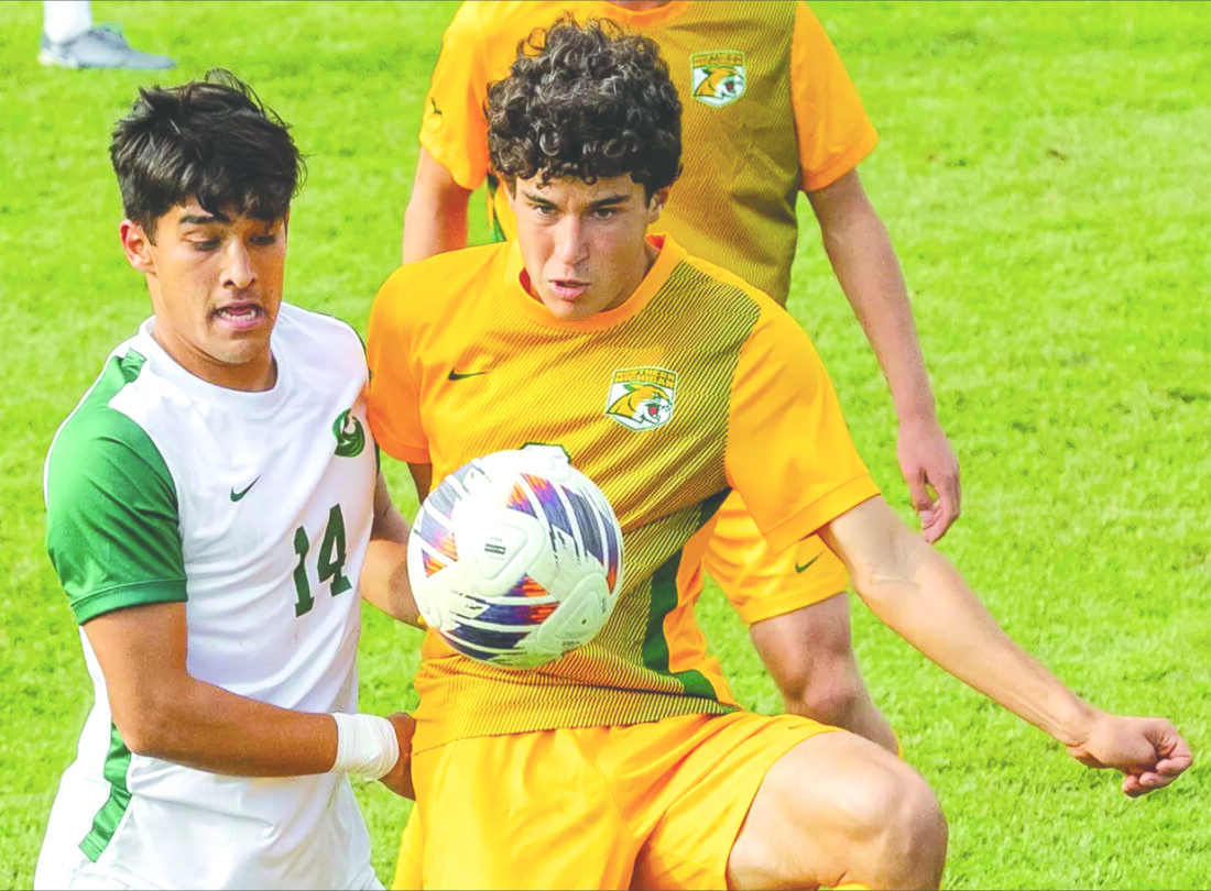 Northern Michigan University men’s soccer player Alessandro Scialanga, right, vies for the ball with an opponent during a past Wildcats’ game. (Photo courtesy NMU)