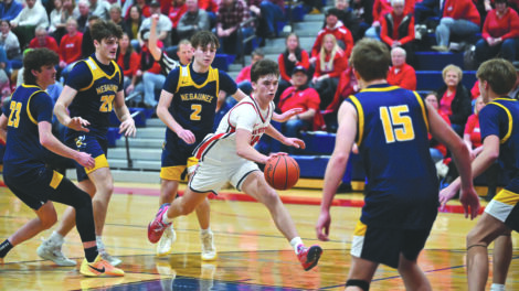 - Westwood’s Ethan Marta, center, dribbles through the lane and past all five Negaunee defenders for a layup during a high school boys basketball game played against Negaunee at the Patriots’ gym in Ishpeming on Friday. Marta set the school single-game record with 46 points. (Photo courtesy Cara Kamps)