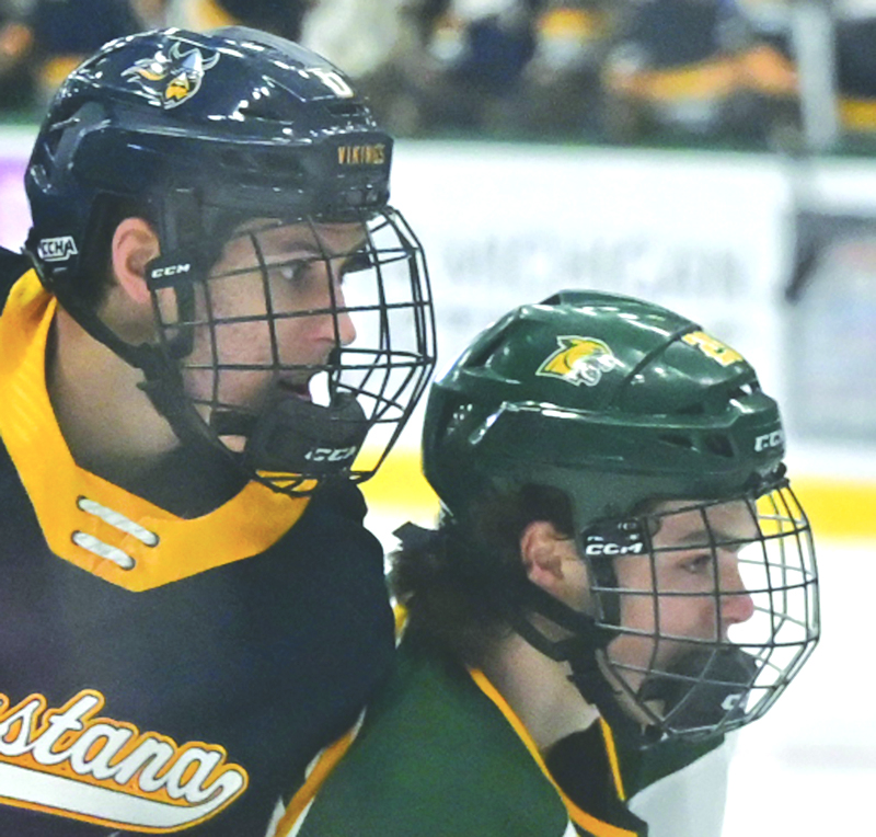 - Northern Michigan University’s Aidyn Hutchinson, right, and Augustana’s Samo Meritahti wait for the play during their CCHA game played at the Berry Events Center in Marquette on Jan. 10. (Photo courtesy Cara Kamps)
