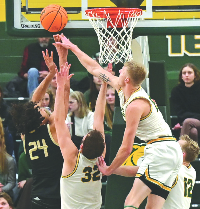 Northern Michigan University’s Dylan Kuehl, top right, blocks a shot by Purdue Northwest’s Kyle Ross, left, during their GLIAC men’s basketball game played at Vandament Arena in Marquette on Thursday. (Photo courtesy Cara Kamps)